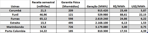 - Na segunda coluna, segundo o relatório citado, a receita do 1º semestre de 2013 em milhões de reais de cada usina.