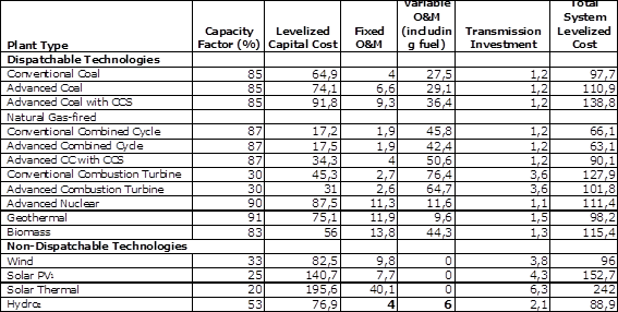 Fonte: US Energy Information Administration : Levelized costs of new generation resources in the Annual Energy Outlook 2012