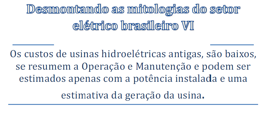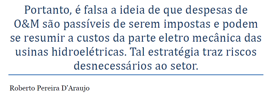 - Não há duas usinas hidroelétricas iguais, nem que elas tenham a mesma capacidade instalada e a mesma GF. Essas usinas não são como térmicas e eólicas, meras fábricas de kWh. Tratar o problema desse jeito significa desacoplar a usina do seu reservatório e do seu ambiente sócio econômico, pois nenhum custo relacionado a esse mundo pode ser incluído no O&M adotado pela ANEEL.