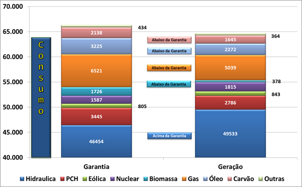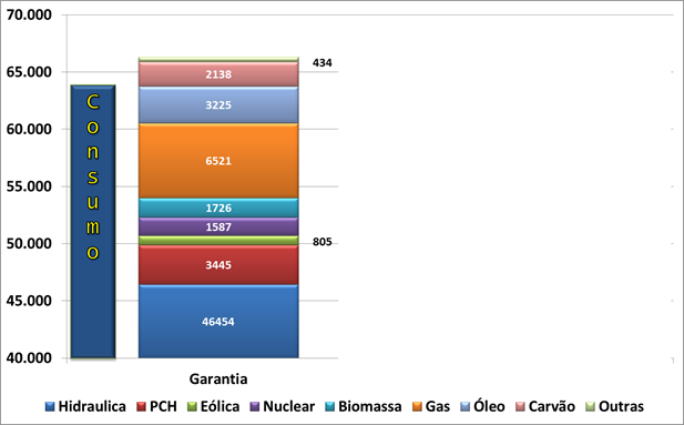 A figura abaixo mostra o consumo comparado à “garantia física” das diversas formas de geração. Como se vê, está tudo às mil maravilhas! Consumo = 64.643 MW médios. Garantia Física Total = 66.336 MW médios. Folga = 1.692 MW médios. Folga de 2,5%!