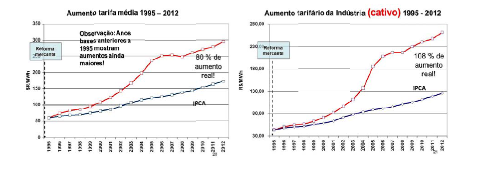 - Aumentos de mais de 30% para as distribuidoras compensando a queda de demanda decorrente do racionamento no período 2002 – 2004.Alguns exemplos: Em 2003, CEMIG – 31,53%. COELCE – 31,29% – COELBA – 31,49% , CPFL – 19,25%, Bandeirante – 18,08%, ENERSUL – 32,59%, ENERGIPE – 31,18%. Em 2004, ESCELSA – 19,89%, COPEL – 14,43%. Em 2005, CELPE – 24,43%, Manaus Energia – 19,07%.[1]