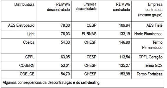 - Descontratação de 2003 – self dealing – troca de energia das estatais por energia de usinas das distribuidoras com preços até 150% mais caros. A carga havia se reduzido em 15% e, a perda de contrato das estatais equivaleu a assumir o prejuízo da redução do consumo nas empresas públicas. Sob o mantra de “respeito aos contratos” implantou-se o desrespeito ao consumidor.