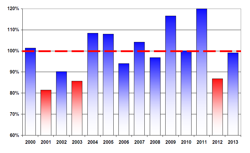No gráfico é possível perceber que apenas nos anos 2001, 2003 e 2012 foram observadas energias naturais menores do que 90% da média (colunas vermelhas). Porque é importante mostrar esse dado tão básico?