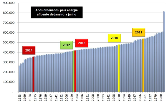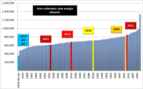 Claro que 2014 não é um ano chuvoso. Mas em termos de energia afluente, há nove anos no histórico onde a situação foi pior. Vejam os gráficos abaixo (Valores em MW médios), onde o segundo mostra a situação até junho de cada ano. Como já mostramos diversas vezes, os últimos quatro anos incluem 2 anos extraordinários (2009 e 2011). Com uma gestão adequada da reserva, podemos reclamar??
