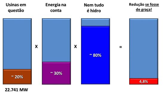 Portanto, se a energia das usinas sujeita à intervenção fosse entregue gratuitamente, a redução máxima não ultrapassaria 4,8%.