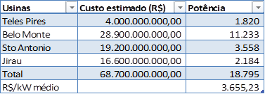 Mas, quando uma instituição importante como a FIESP apresenta uma tese, é preciso checar a questão. Na tabela abaixo, os custos estimados dos projetos exemplos da FIESP, onde se vê que o custo médio dos 4 projetos é de R$ 3.655,23/kW. Muitas dessas estimativas de custos já foram ultrapassadas, mas vamos fazer as contas assim mesmo.
