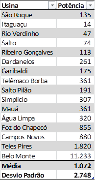 A tabela abaixo mostra as potências das usinas do banco de dados (não informada no documento do MME!)