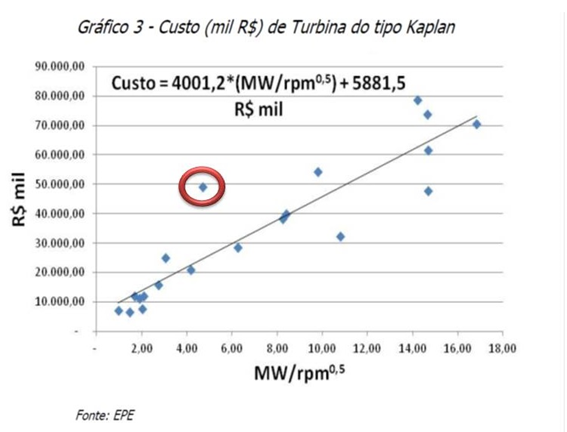 A CESP está contestando esse valor. O que o ILUMINA acha muito estranho é que ninguém faça uma análise da metodologia desses preços. Apenas num rápido exame, analisando apenas um item, detectamos inconsistências graves. O gráfico abaixo mostra que, para julgar o custo de turbinas tipo Kaplan, foi construído um banco de dados com usinas recém construídas ou ainda por construir. São visíveis os erros em relação às próprias usinas do banco de dados. O exemplo marcado com o circulo vermelho apresenta um desvio negativo de R$ 30.000/MW/rpm 0,5. Isso significa um viés de -100% em uma usina do próprio banco de dados. Traduzindo, se essa usina que foi usada para compor a função linear apresentada fosse “julgada” pelo VNR, provavelmente seria reprovada.