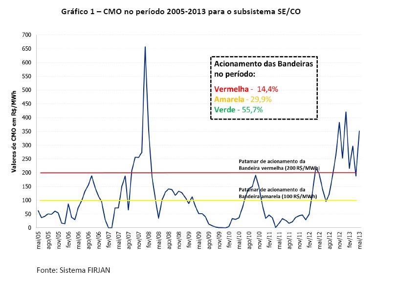 Estudo da Firjan mostra que, se o sistema de bandeiras tivesse em vigor em 2012, o gasto extra com energia chegaria a R$ 1,5 bilhão, sendo R$ 400 milhões em tributos. O cálculo considerou cinco meses de bandeira amarela, quatro de vermelha e três de verde, pois em 2012 choveu pouco.
