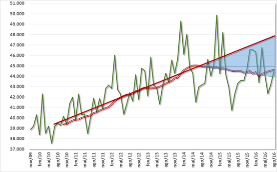 - A curva vermelha dupla é a média móvel de 12 meses, onde se pode ver que a carga parou de crescer desde agosto de 2014 e, na realidade, apresentou um ligeiro decréscimo.