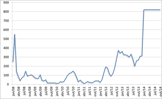 O que intriga a qualquer um com um pouco de raciocínio dedutivo, é que, dada a evolução do PLD (gráfico abaixo), será que as térmicas mais baratas foram usadas na hora certa? O que faziam essas térmicas mais baratas até setembro de 2012? E agora a pergunta para o pessoal do setor: A FORMAÇÃO DOS PREÇOS ESTÁ CORRETA?