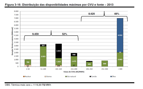 Como se pode ver, temos cerca de 9.500 MW médios de usinas térmicas com custos abaixo de R$ 200/MWh e 8.620 MW médios acima de R$ 200/MWh. Mas o que chama a atenção é que mais de 80% estão concentrados em térmicas com custos acima de R$300/MWh. Pior! Quase 60% são térmicas a óleo, com custos que chegam a mais de R$ 1000/MWh.
