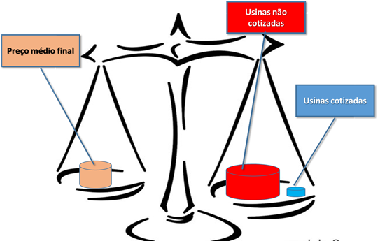 Se as usinas cotizadas são aproximadamente 15% do total e vendem energia por R$ 30, mas a tarifa final é R$ 290, qual o valor dos 85%, na figura, o cilindro vermelho?