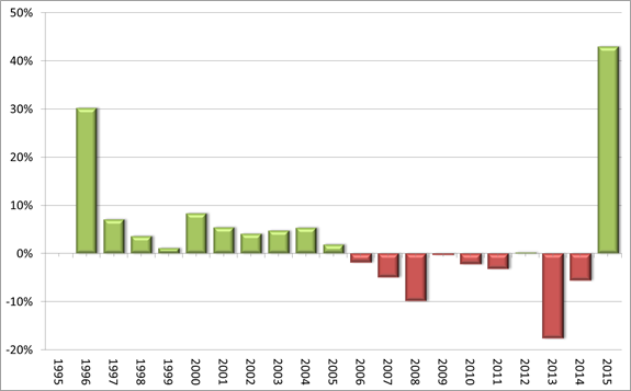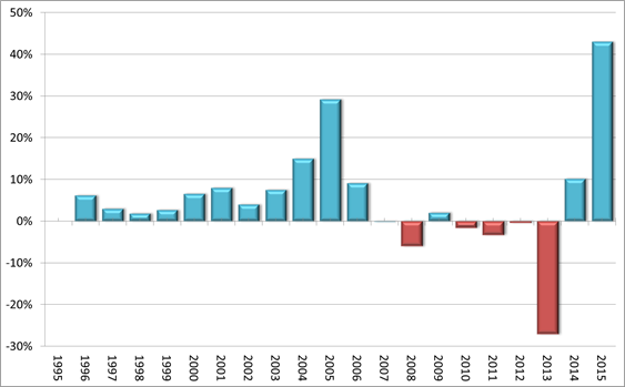 No segundo gráfico, a mesma informação com barras verdes e vermelhas para o setor residencial. Saldo do período 1996 – 2015 = + 70%.
