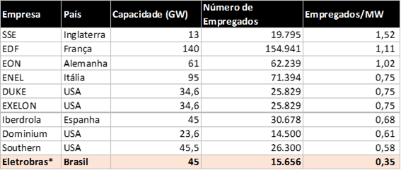 A Eletrobras, comparada com as maiores empresas de energia do mundo é a que tem o menor índice empregado por MW instalado.