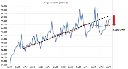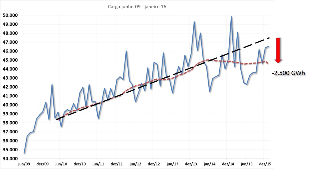 Observem que, se o país estivesse com a economia mais ou menos em ordem, a média móvel da carga estaria 2.500 GWh mais alta. Na realidade, por outros erros de gestão, o consumo energético está estagnado desde junho de 2014.