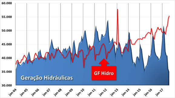 - O gráfico abaixo mostra que, na grande maioria do tempo, usinas hidroelétricas geram acima de sua GF.