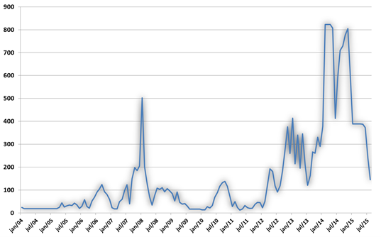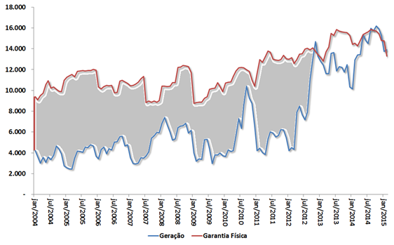 A figura abaixo mostra o que ocorreu com as hidráulicas desde 2004. Como se pode ver, de 2009 até setembro de 2012 as hidráulicas geraram bem acima de sua garantia física. Evidentemente, nesse período muitas térmicas contabilizadas como oferta não geraram. Essa “singularidade” brasileira pode ser contatada no gráfico seguinte ao das hidráulicas.