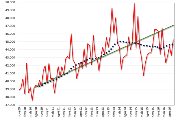 Claro que estamos no início do período chuvoso, mas é preciso considerar que a grave recessão brasileira reduziu bastante o consumo de energia elétrica de todo o país. A curva abaixo mostra que a carga está estagnada desde maio de 2014. Se estivéssemos na trajetória ascendente da reta verde, a situação seria gravíssima.