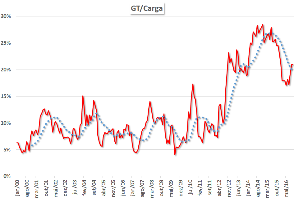 A figura acima mostra a evolução da reserva hidráulica de todo o nosso sistema de reservatórios comparada à carga de cada mês no sistema interligado. Cada ponto da curva azul é igual à divisão da reserva pela carga daquele mês. A curva pontilhada vermelha é a média móvel de 12 meses da curva azul.