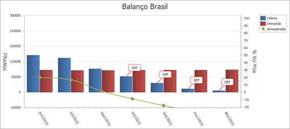 A situação do sistema, na verdade, já justifica a adoção de outro racionamento de energia. Para mostrar isso, foi avaliada as condições de atendimento a partir do simulador disponível na Plataforma de Inteligência de Mercado de Energia Elétrica (PIMEE) desenvolvido pela Engenho Consultoria.[3] Para esta análise, foi considerado o mercado verificado em maio de 2015 de 73 mil MWmédios e uma evolução até dezembro do mesmo ano acompanhando a variação média dos últimos dez anos. Além disso, considerou-se por questões de segurança do sistema, uma disponibilidade térmica de 90%; disponibilidade de toda geração não despachável e; um volume mínimo dos reservatórios de 20%. O resultado mostra um déficit de energia já em setembro deste ano, como mostra o Gráfico 4.