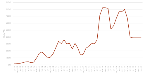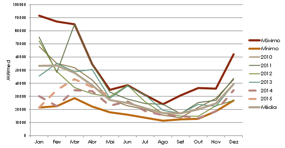 Nos últimos anos, o país vem passado por condições hidrológicas desfavoráveis, que tem contribuído para a redução dos níveis dos reservatórios, com um consequente aumento da tarifa de energia por conta da geração termelétrica. Em 2014, a energia natural afluente (ENA) do subsistema Sudeste/C.Oeste (SE/CO) menor que a média dos últimos cinco anos, conforme pode ser visto no Gráfico 1, a seguir.