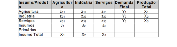 A matriz insumo-produto (ou modelo de Leontief[4]) representa as relações intersetoriais da economia, a partir de dados observados em um determinado período de tempo, normalmente um ano contábil. Nela é descrito o destino da produção dos vários setores da economia, que serão utilizados como insumo em outros setores ou consumidos pelos demandantes finais. Estas informações compõem as linhas da matriz, que são acrescentadas dos valores adicionados (ou insumos primários), que completam os insumos utilizados nos processos produtivos dos diversos setores e representam o Produto Interno Bruto (PIB) da economia. A Tabela 1 ilustra estas relações.