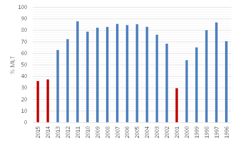 Como consequência, há uma forte redução no nível de armazenamento dos reservatórios do SE/CO[2] elevam sobremaneira o risco de déficit no sistema. Nos meses de maio de 2014 e 2015, os patamares estão próximos aos de 2001, quando foi adotado o racionamento, como mostra o Gráfico 3.