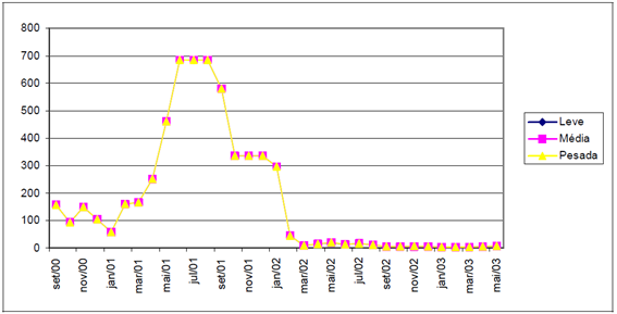 Para esta simulação, foram adotadas as mesmas hipóteses da anterior, com exceção do mercado que foi 20%. Na verdade, o aumento da tarifa de energia pode desempenhar este papel de reduzir o mercado, porém a um custo muito maior para sociedade. No racionamento de 2001, o preço do extinto Mercado Atacadista de Energia (MAE) se elevou bastante no referido ano, mas acomodou-se no ano seguinte, como mostra o Gráfico 6 a seguir.