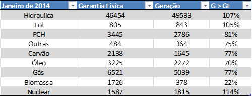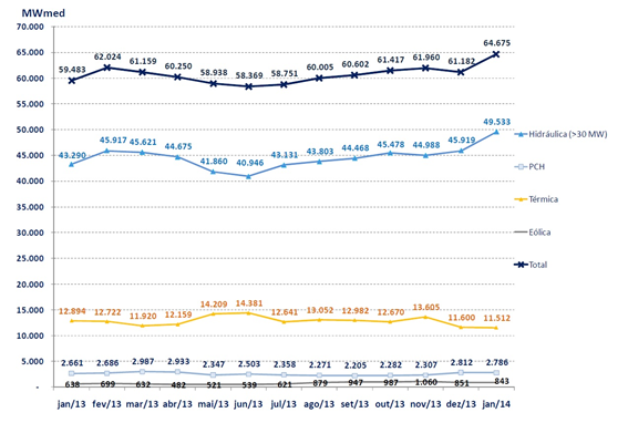 A geração das hidráulicas subiu de 45.919 MW médios para 49.533 MW médios. De Novembro de 2013 até Janeiro de 2014 as térmicas diminuíram sua geração em 2093 MW médios (!).
