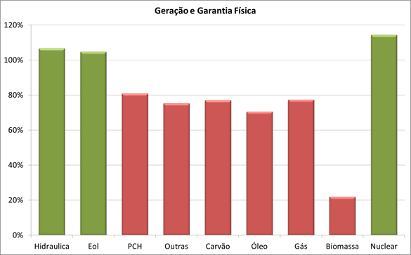 O gráfico abaixo compara a geração real e a garantia física das formas de geração em %. (Fonte CCEE)