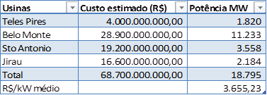Nessa campanha, para mostrar o alto custo das usinas antigas, a federação “criou uma usina de referência a partir dos dados públicos dos leilões de Jirau, Sto. Antônio, Belo Monte e Teles Pires”. Afinal, como usinas novas podem ter preços comparáveis? Bem, segundo dados atualizados sobre esses projetos, a tabela abaixo mostra o custo médio por kW instalado dessas usinas.