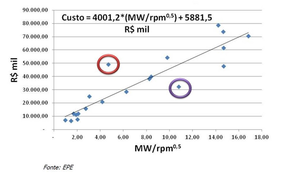 Já é estranho usar dados de usinas novas para avaliar custos de usinas antigas, construídas em outras épocas tecnológicas. Como se não bastasse, no gráfico, são visíveis os erros em relação às próprias usinas do banco de dados. O exemplo marcado com o circulo vermelho apresenta um desvio negativo de R$ 25.000,00/MW/rpm 0,5. Isso significa um viés de -100% em uma usina do próprio banco de dados. O circulo azul mostra um caso onde o custo é sobrestimado em 60%.