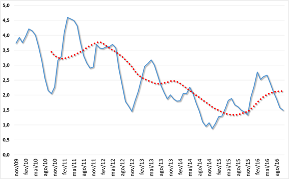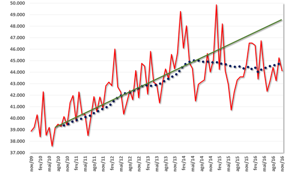 Uma ligeira recuperação da média móvel (linha de pontos vermelhos) pode ser percebida, mas o trajeto de longo prazo é de decréscimo da reserva.