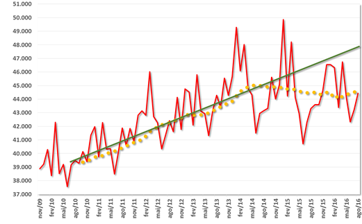 O gráfico acima é a expressão do que ocorreu com o consumo de energia desde maio de 2009. A curva pontilhada amarela é a média móvel da carga (cada ponto amarelo é a média dos últimos 12 valores). A reta verde é simplesmente a extensão da tendência de crescimento verificada desde 2009.