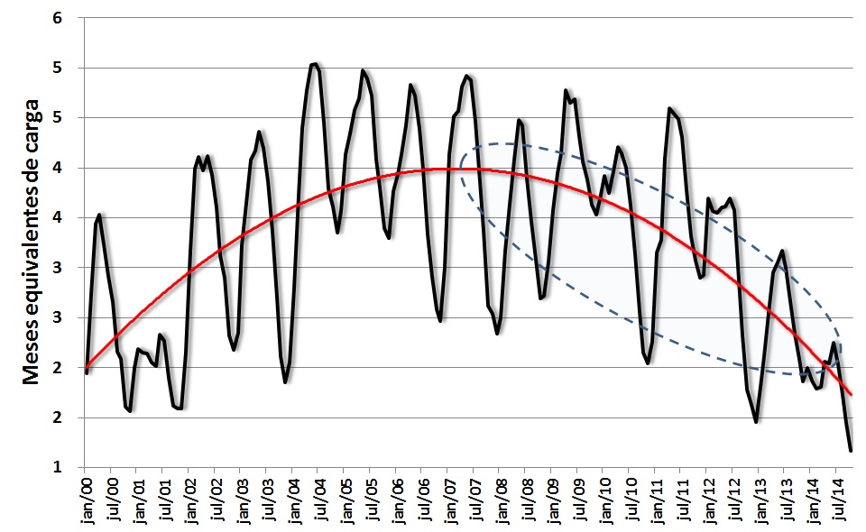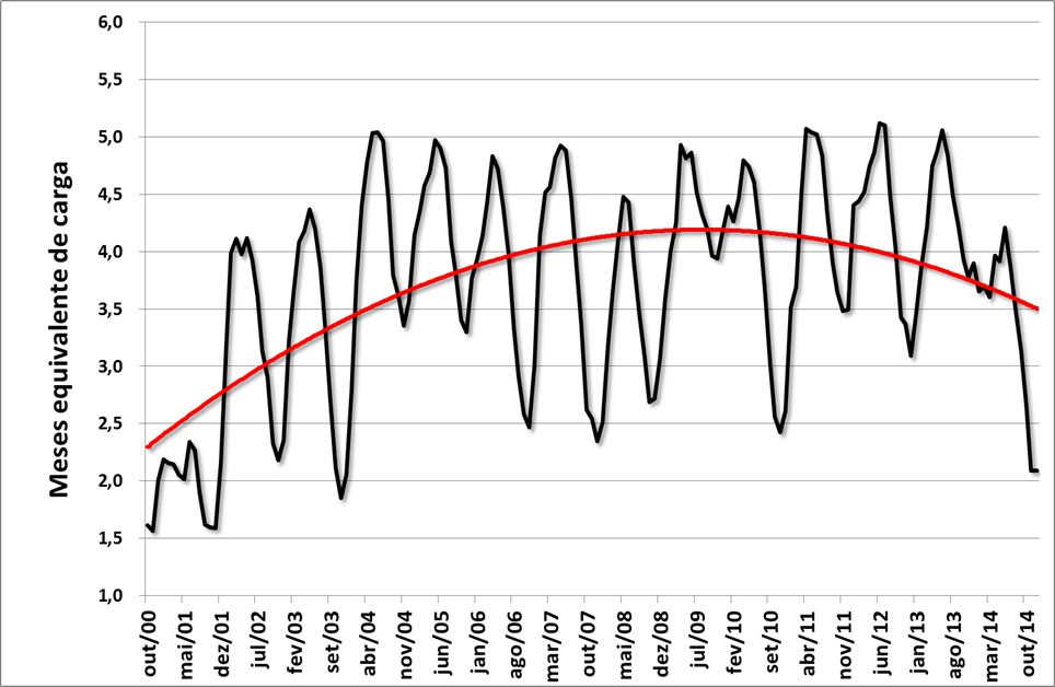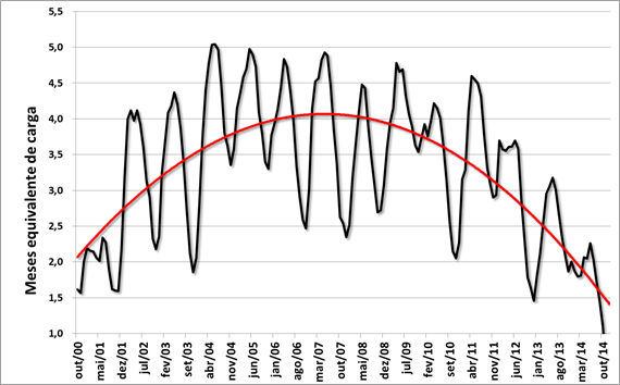 Para mostrar esse aspecto, ainda consideramos o gráfico abaixo (Número de meses de carga armazenado no sistema) como o retrato mais abrangente sobre a crise, pois mostra que o declínio já estava claro desde 2009.