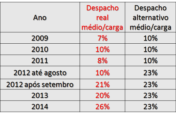O gráfico acima foi obtido adotando-se um critério de despacho térmico alternativo e simplificado proporcional à carga. De 2009 até 2011, as térmicas gerariam 10% da carga e, de 2012 até 2014, 23% da carga. Em termos médios, essa estratégia difere da adotada pela operação da seguinte maneira.