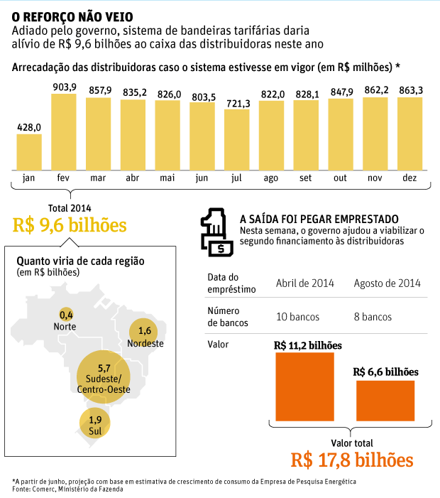 Em teste desde 2013, o sistema de bandeiras tarifárias deveria ter entrado em operação em janeiro deste ano, mas foi adiado pelo governo para 2015. Com ele, a tarifa de energia passaria a flutuar mensalmente seguindo o uso de usinas termelétricas.