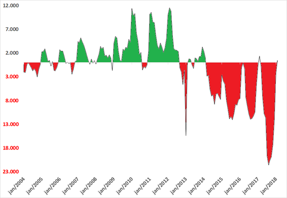 O que vemos abaixo é que de 2004 até 2013, as hidráulicas geraram acima desse seu certificado (área verde). De 2013 até 2018, geraram bem abaixo (área vermelha). Geralmente, em qualquer sistema que conta com alguma lógica de longo prazo, saldos podem gerar fundos para compensar déficits. Por exemplo, hidráulicas poderiam capturar parte da receita da venda nos períodos de saldo para compensar possíveis prejuízos no período de déficit. Quando a própria organização do mercado não prevê isso, uma das formas de fazê-lo é um seguro.