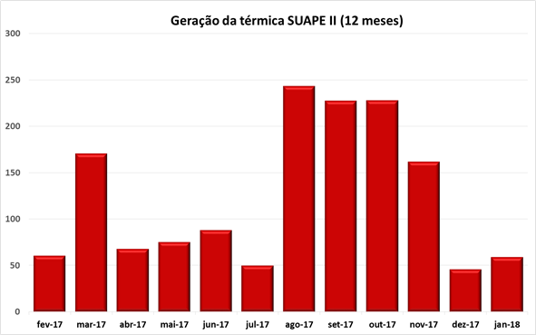 O Gráfico abaixo mostra a geração da térmica de fevereiro de 2017 até janeiro de 2012 (12 meses) em GWh. Nesses 12 meses essa usina gerou 1477,74 GWh a um custo estimado de R$ 650.205.974,44. Assume-se um custo de operação de R$ 440/MWh.